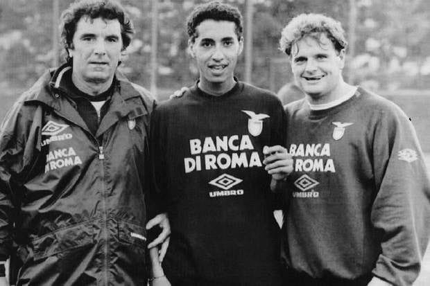 1993年,年轻的萨阿迪·卡扎菲(中)在罗马,应邀参加拉齐奥队的一次训练课,站在主教练佐夫与球员加斯科因之间。